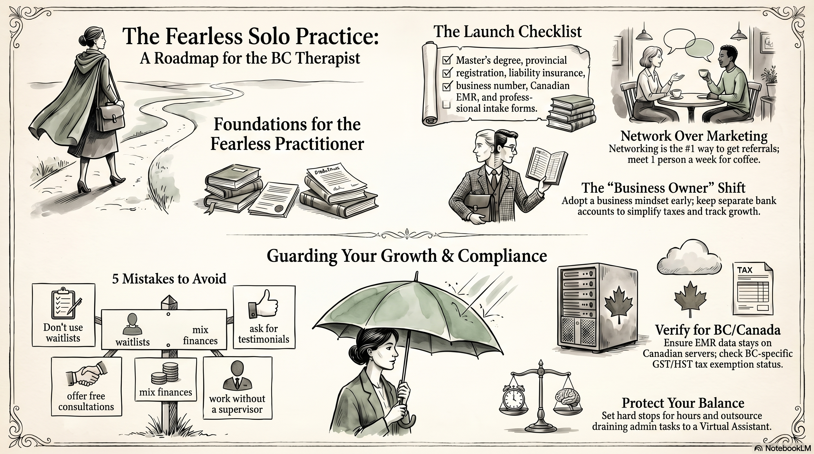 From first session to full caseload — marketing systems, client experience design, and the financial runway that keeps you afloat.